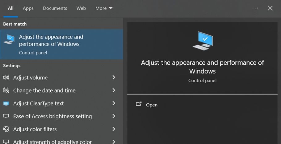 - Search Adjust the appearance and performance of Windows in the search bar and open it.
